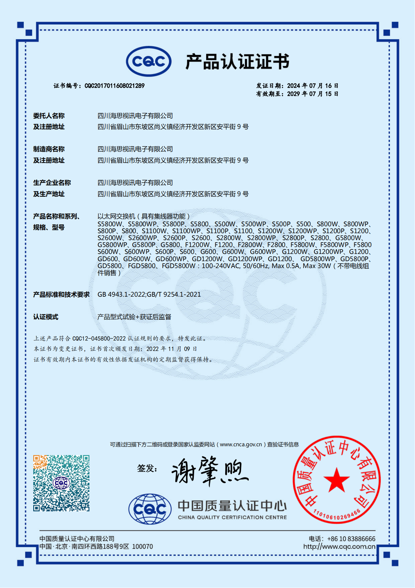 国家强制性产品认证CQC证书